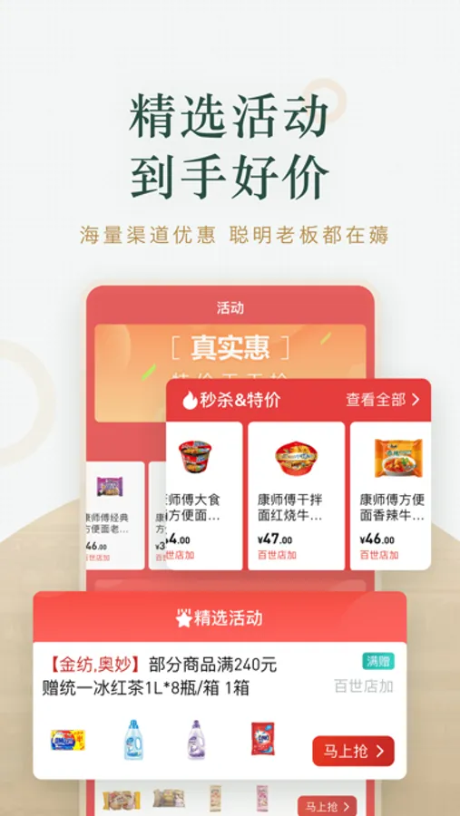 京东掌柜宝、阿里零售通、易久批等电商及本地批发部的。满减、满折、满赠等活动信息时时同步。网罗各渠道全品类秒杀特价,低价优质商品特惠推荐。活动大集合,开心享不停!