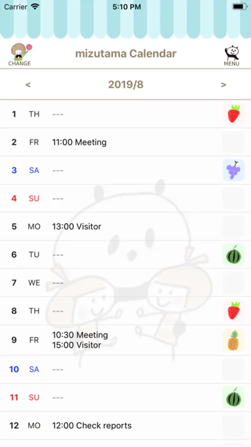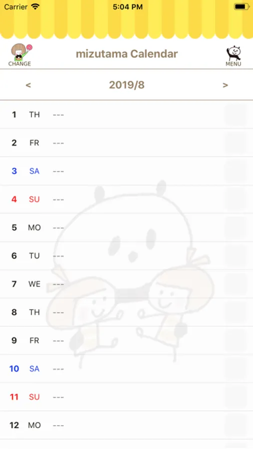This is a vertical calendar application with illustrations of illustrator mizutama.