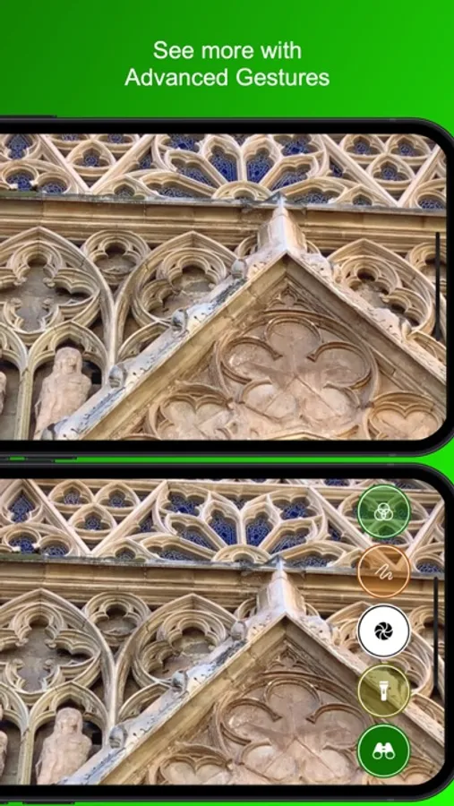 Zoom in and out with a single finger. You can use that same finger to brighten or dim the screen. How about freezing the image? Sure, that same finger can do it all! Gestural commands save time and there is no need to hunt for tiny little onscreen icons, just simply slide or hold your finger on the screen.