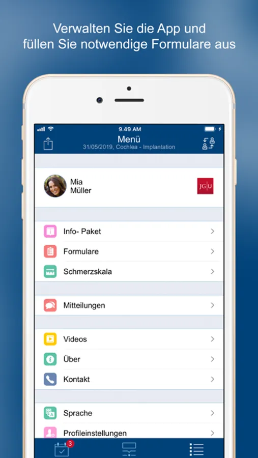 Die Universitätsmedizin der Johannes Gutenberg-Universität Mainz ist die einzige medizinische Einrichtung der Supramaximalversorgung in Rheinland-Pfalz und ein international anerkannter Wissenschaftsstandort. Unsere mehr als 60 Kliniken, Institute und Abteilungen repräsentieren das gesamte Spektrum der modernen Medizin. Eine optimale Patientenversorgung basierend auf modernsten Diagnose- und Therapieverfahren und neusten Forschungserkenntnissen ist unser Anspruch. Leitlinie unseres Handelns ist das Prinzip »Unser Wissen für Ihre Gesundheit«.