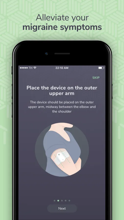 This prescribed device is self-applied to the upper-arm and should be used in the home environment at the onset of migraine headache or aura, or every other day for preventive treatment.