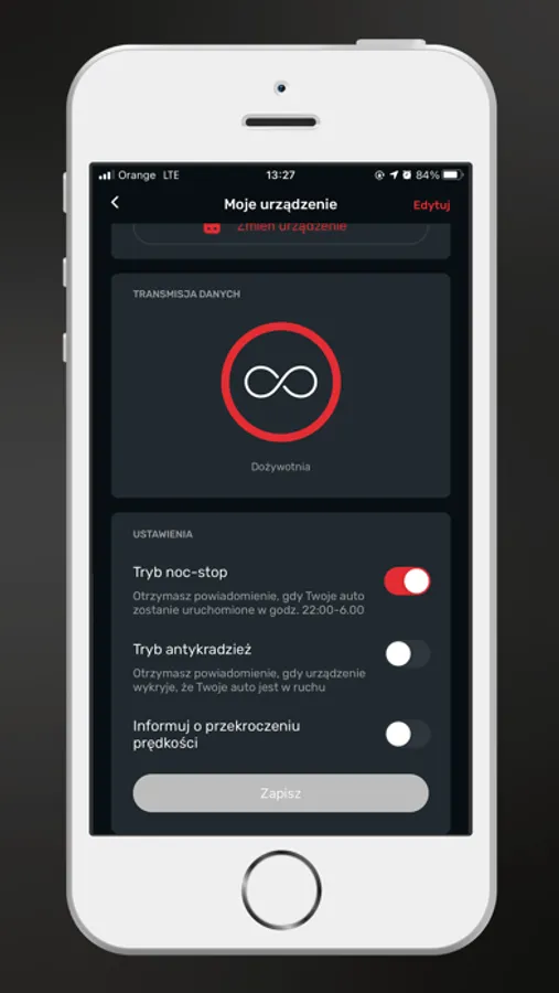 - powiadomienie noc-stop, gdy Twoje auto będzie w ruchu w godzinach nocnych,