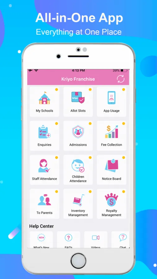 If you are Preschool or Childcare center brand/chain, you 'll certain to get benefited from this app. It gives you a birds eye view into all your branches/centers. You can manage your centers (View/Add/Edit), allocate more slots to add children in their respective centers, view the app usage by your schools' admins / staff / parents. You can also keep track of Enquiries and Admissions for each or all the branches. Also available is the option to track Staff and Children Attendance across all your centers.