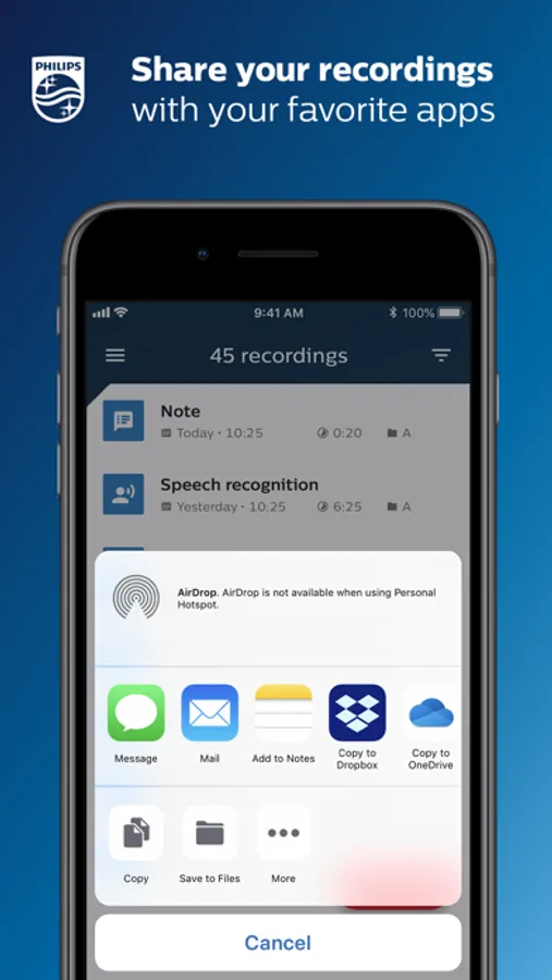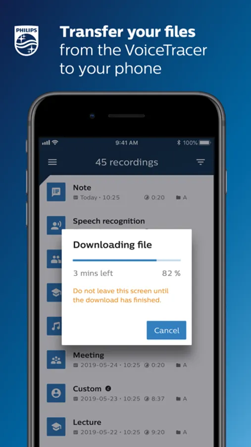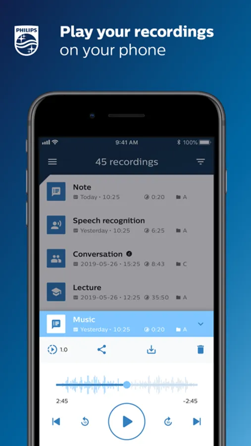Transfer your recordings straight from your Philips VoiceTracer to your smartphone via Wi-Fi to playback and instantly share them with friends and family using this convenient app.