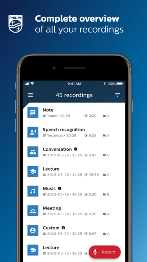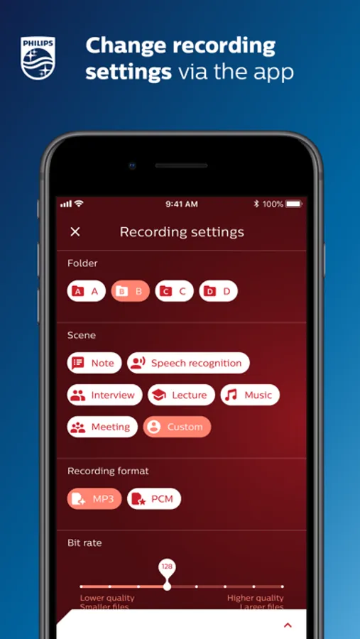 Control your Philips VoiceTracer Audio Recorder using your smartphone, even from a distance. The app makes recording lectures, meetings or music much easier and more convenient. You can place your recorder in the front of the room near the speaker, take a seat at the back, and still control and adjust the recording comfortably and without interrupting others. You can remotely pause and restart the recording whenever needed and mark any important positions by setting bookmarks.