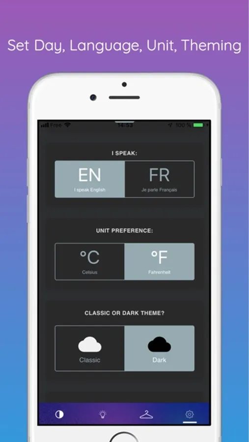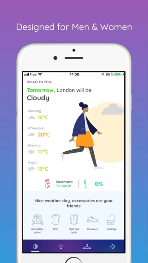 A large number of clothing proposals to wear for men and women, with a very pleasant design, simple to read. At a glance you have the vision for your day. Images are there to let you understand the day's weather in less than a second.