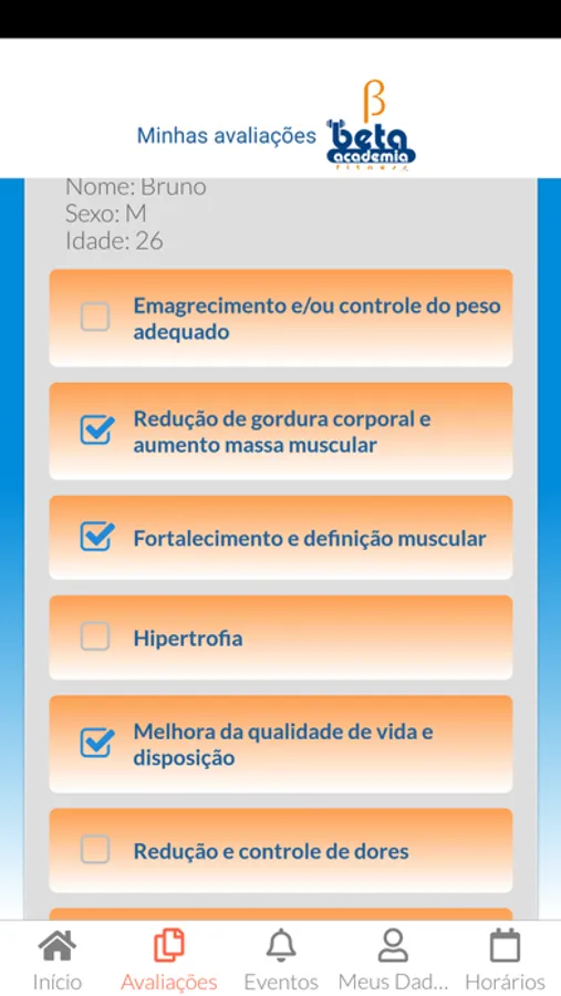 Aplicativo para registro e acompanhamento de atividades e avaliação feitas na Academia Beta Fitness.