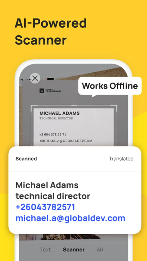 The app uses our own AI-powered text recognition (OCR) technology. The artificial neural network that is built using deep learning algorithms runs right on your phone. This allows you to scan text incredibly quickly and efficiently.