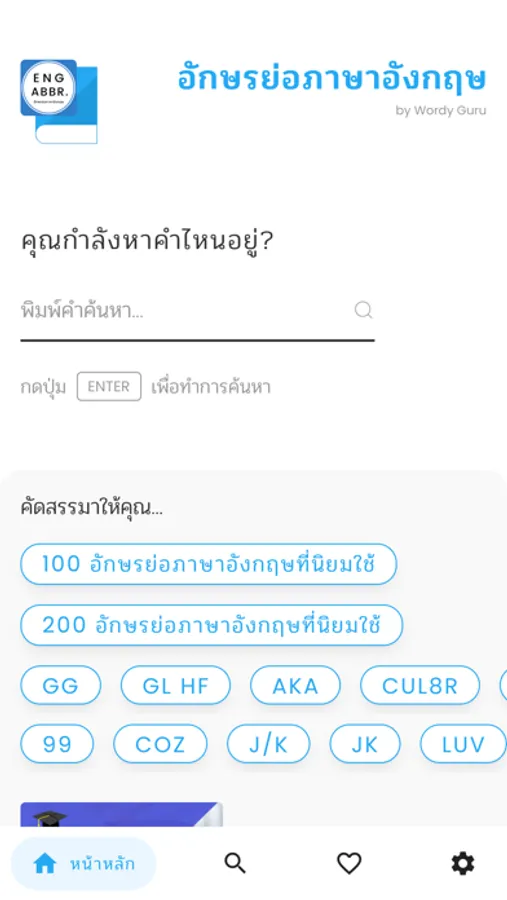 ในภาษาอังกฤษมีตัวย่อ คำย่อ อักษรย่อ และคำสั้น ๆ เยอะเสียจนบางคนแปลผิดแปลถูก บางครั้งไม่รู้ว่าย่อมาจากอะไร ยิ่งตอนฟังข่าวหรืออ่านหนังสือพิมพ์เล่นเอาปวดหัวไปตาม ๆ กัน ต่อไปนี้ไม่ต้องปวดหัวอีกแล้วเพราะแอปพลิเคชันนี้ได้รวบรวมอักษรย่อมาไว้ในมือคุณ