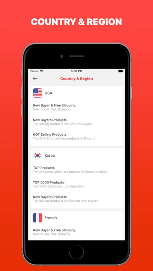 • Country & Region: Hot & Top products in the country and region (USA, Korea, Russia, French, Spain, ...).