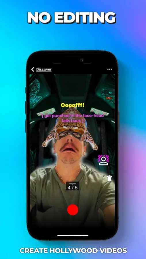 Use Punch’s technology to instantaneously replace your background while wearing augmented reality costumes to put you IN the scene of your favorite Meme, Sporting Event, Game Show, Show, or Movie. Punch automatically displays the suggested dialogue at the top of the screen, so you know what to say and when to say it, allowing YOU to create a personalized one-of-a-kind piece of content. Punch also adds that hollywoodification by inserting music, transitions and other video surprises that’ll make you look like a STAR so that you are able to share with your friends, family and enemies in under 30 seconds or less.