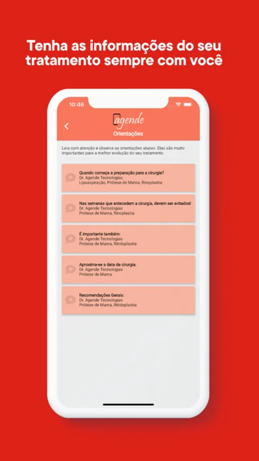 Tenha as informações do seu tratamento sempre com você: Acesse a qualquer momento as ORIENTAÇÕES e INFORMAÇÕES importantes sobre a sua cirurgia ou procedimento estético. Com maior possibilidade de compreensão e esclarecimento de dúvidas, você terá mais segurança e comodidade nesse momento tão especial da sua vida.