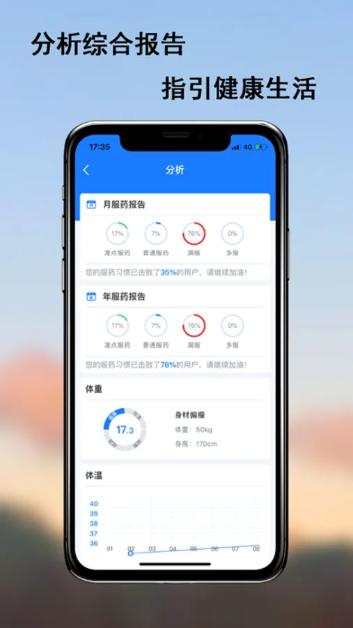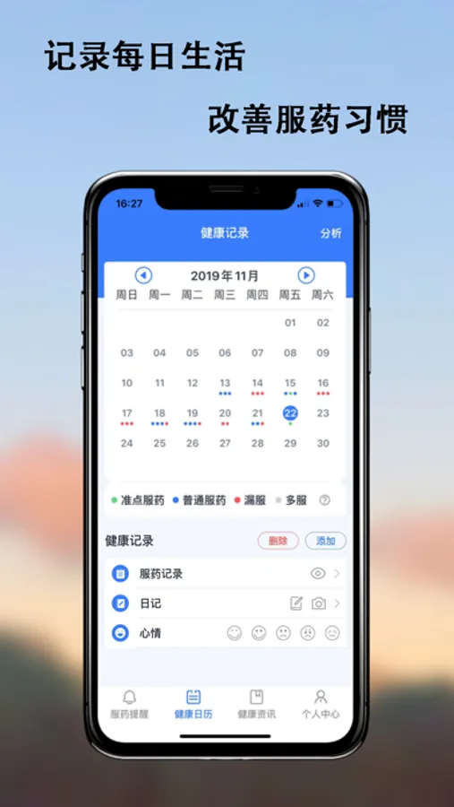 【健康记录】记录血压、血糖、体重等各类身体状况,并与服用记录、日历等其他健康记录一起汇总分析,生成健康分析报告,方便回顾。可以远程查看服药历史记录,当数据异常时,及时提醒用户及其关联亲友。