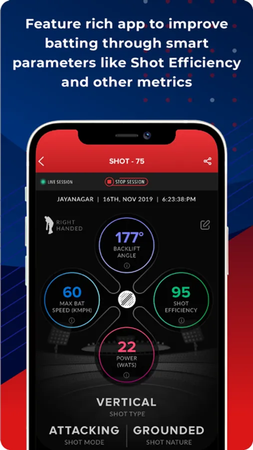Data captured by our smart cricket batting sensor, BatSense and collected by the SmartCricket app is presented in 11 comprehensive parameters which can assist you in altering, modifying, changing or correcting your game. Parameters like Bat Speed, Bat Angles, Back Lift, Follow-through and Impact Angles etc. will bring a whole new perspective to the game.