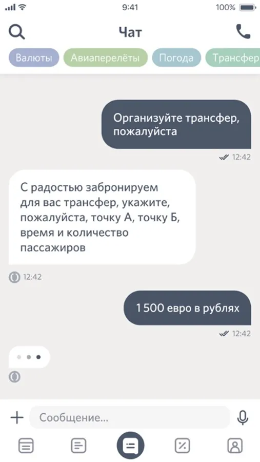 ∙ с помощью умного бота оперативно получать информацию о курсах валют, визах, правилах провоза багажа, ближайших отделениях банка и банкоматах, погоде в любом городе мира
