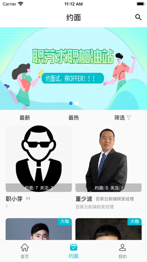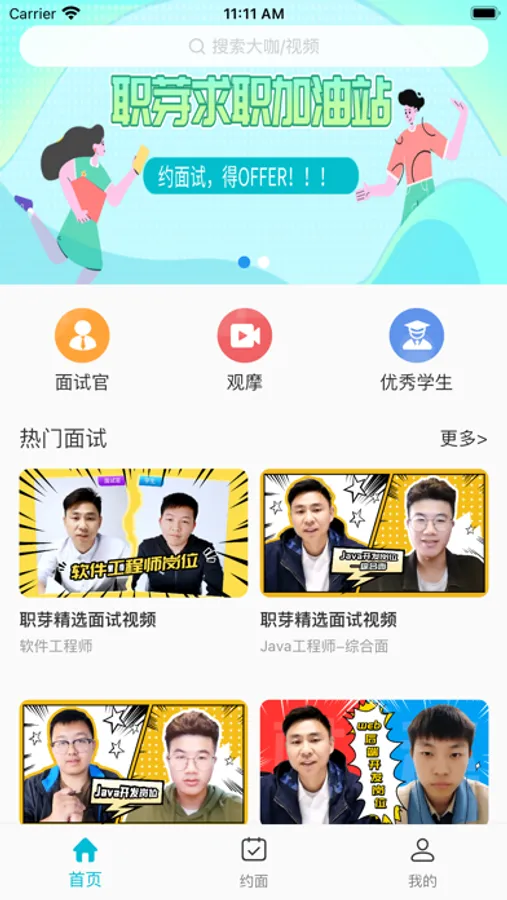 「约面」求职者通过约面在职面试官的形式,体验真实的面试场景。平台汇聚了华为、百度、阿里、腾讯、Realplayer、搜狐、全时、跟谁学、苏宁等众多大厂在职面试官的入驻。面试优异的应届生可以获得在职面试官的公开推荐,让更多的企业HR关注到您,还可以和名企大咖成师徒,为您的职业发展保驾护航。
