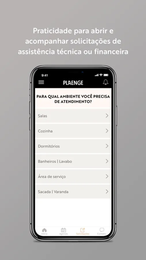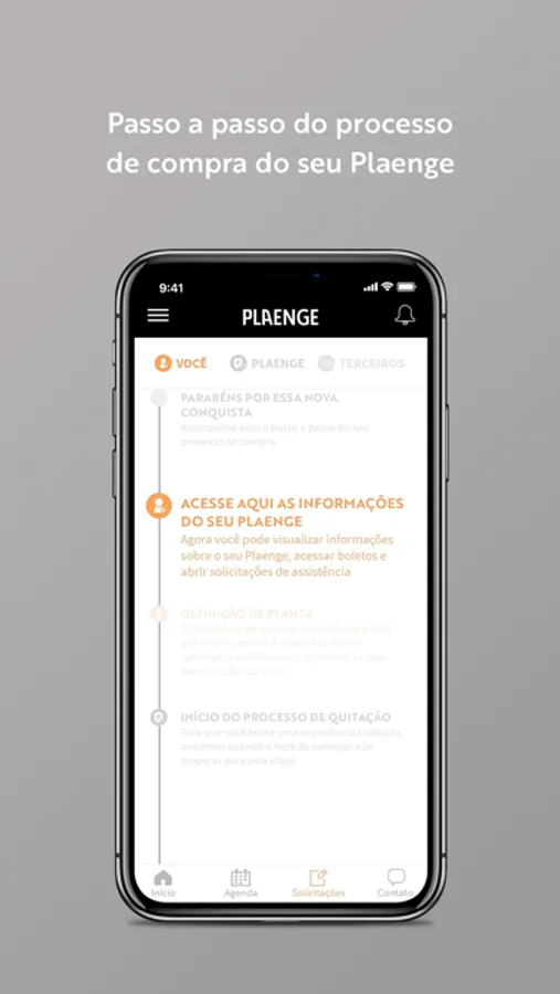 De onde estiver, você poderá conferir o passo a passo do processo de compra, tirar dúvidas sobre seu Plaenge e acompanhar cada etapa de construção do seu apartamento. Também poderá iniciar um atendimento para escolha da sua planta ou negociação de parcelas e abrir, de forma rápida, chamados de assistência técnica ou financeira.