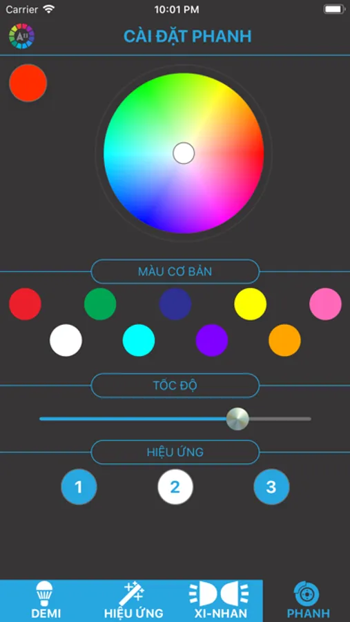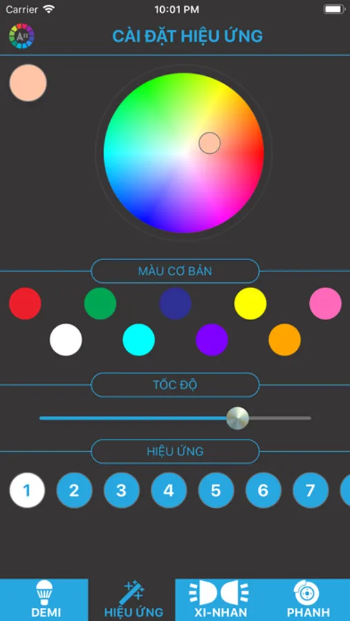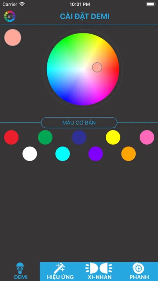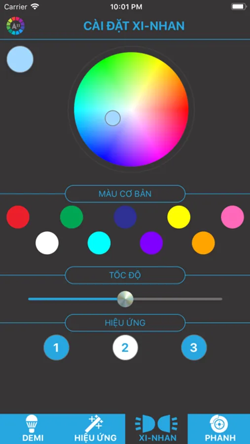 -Tab demi: cài đặt chế độ demi cho Led, người dùng có thể cài đặt màu sắc ở chế độ demi. Có 9 màu cơ bản và vòng màu đa sắc giúp người dùng thoải mái lựa chọn màu sắc mình yêu thích
