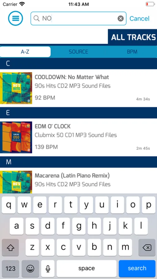 The built-in BPM analysis lets you build your own music library and sort the songs alphabetically, by BPM or source.