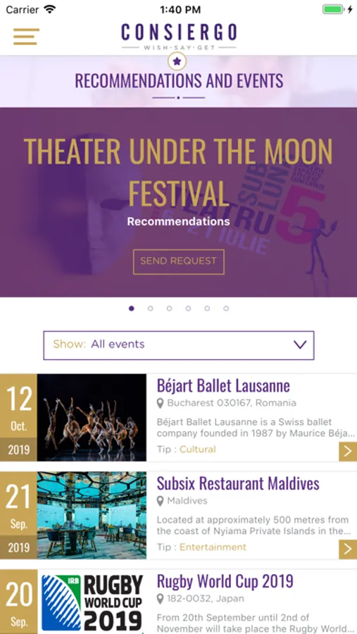 De la rezervări de ultim moment la restaurante din toată lumea, servicii de acomodare sau transport, bilete la operă, teatru sau meciuri sportive sau acces la evenimente „sold-out”, la închirieri de avioane private, elicoptere, yacht-uri sau organizare de petreceri personalizate, asistenții personali ai Consiergo sunt disponibili 24/7 pentru rezolvarea oricărei solicitări venite din partea clienților.