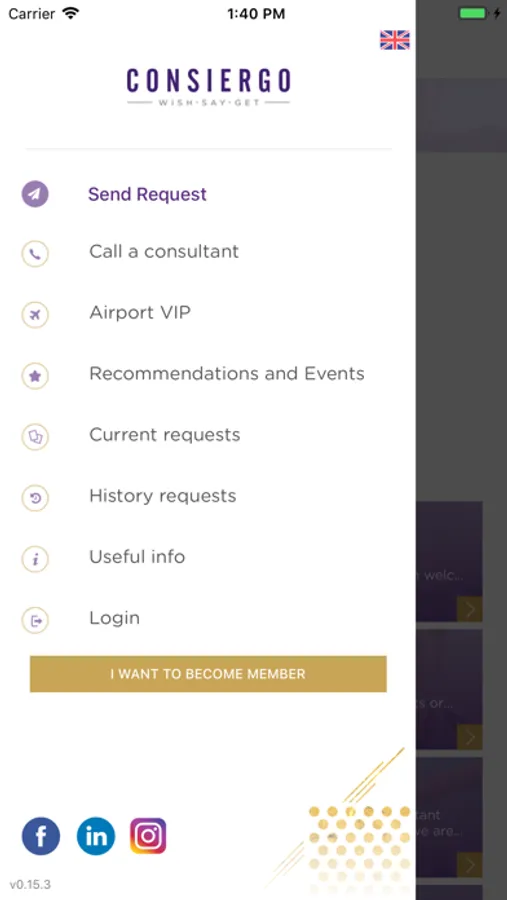 Aplicația vă permite acces la serviciul VIP pentru aeroport, trimite o solicitare scrisă sau suna un consultant pentru mai multe informații legate de serviciile de concierge de care puteți beneficia sau pentru a-i comunica solicitarea dumneavoastră în mod direct