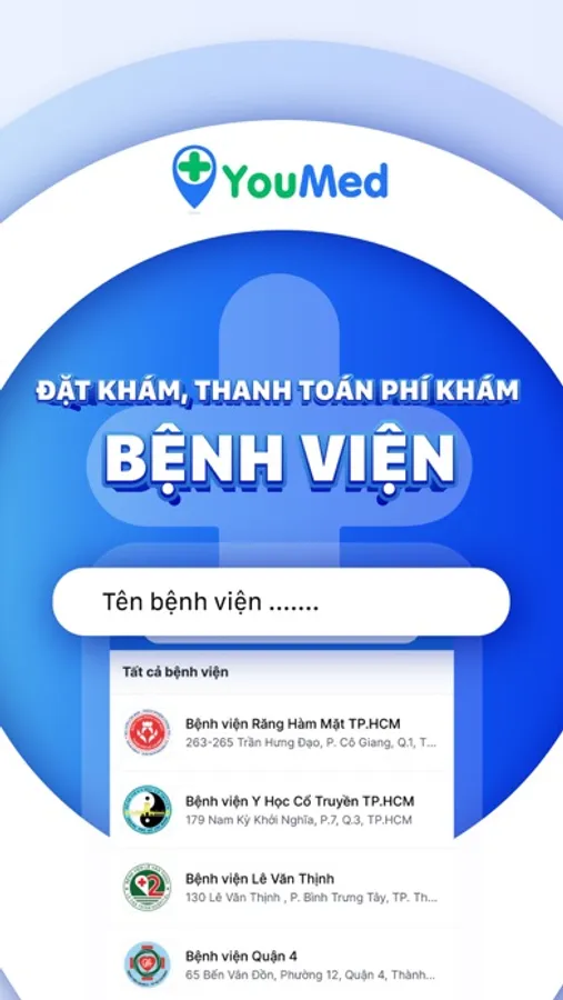 YouMed là ứng dụng đặt khám chính thức và là đối tác độc quyền của các bệnh viện: BV Răng Hàm Mặt TPHCM, BV Y Học Cổ Truyền TPHCM, BV Quân y 175, BV Truyền Máu Huyết Học, BV Thành phố Thủ Đức, BV Tim Mạch An Giang, BV Lê Văn Thịnh, BV Quận 4, BV Quận 8…