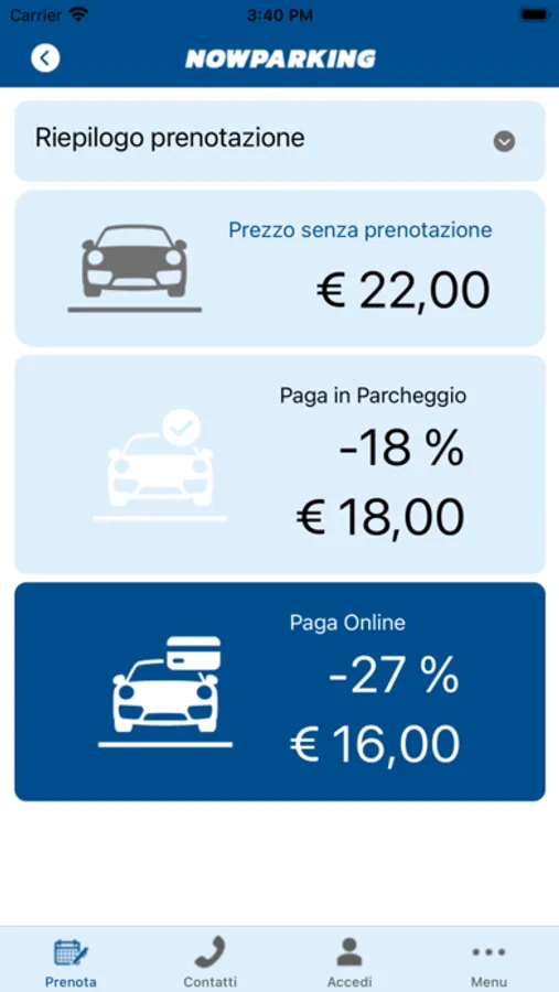 Le tariffe, i metodi di pagamento e le modalità di prenotazione sono quelli dei migliori parcheggi aeroportuali, con offerte ed agevolazioni specifiche, oltre alla possibilità di effettuare prenotazioni e pagamenti on-line, oppure con carte di credito e bancomat o contanti, direttamente in parcheggio.