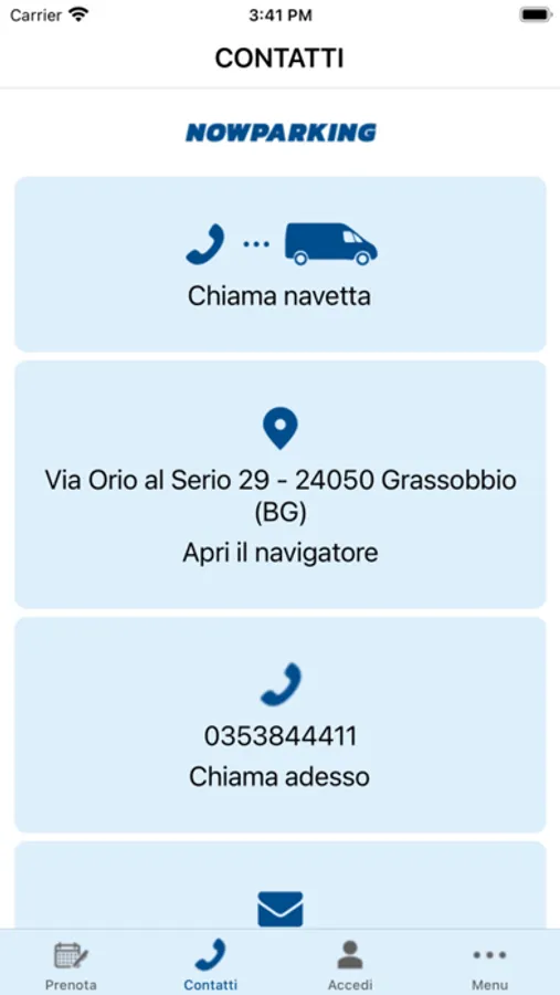 Il parcheggio Now Parking è dotato di moltissimi posti auto, sia scoperti che coperti, presso l’aeroporto internazionale di Orio al Serio, Bergamo, Il Caravaggio, custoditi e videosorvegliati 24 ore su 24. Il parcheggio è sempre aperto, 365 giorni all’anno, con servizio navetta gratuito e personale qualificato anche per servizi accessori come lavaggio auto, ripristino cali batteria, controllo pressione pneumatici e addirittura la possibilità di far effettuare la revisione ministeriale del veicolo, tramite officina autorizzata.