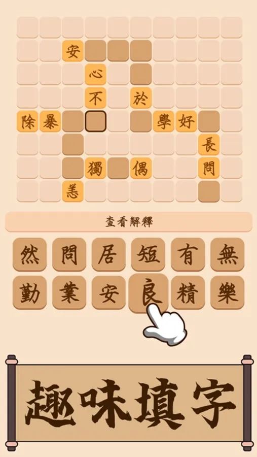 成語填填字是一款闖關類文字遊戲,遊戲界面由不同的横豎空格組成,在已知文字的提示下,將下方的零散文字正確填入上方縱横交錯的詞語空格之中,組成正確的成語就能獲得遊戲勝利!