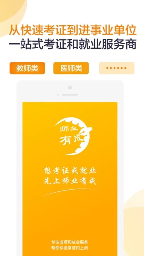 考证虽快必不敢省教研,岗位虽真必不敢减服务!快速成师成业,先上师业有成!师业有成是中国职场社交平台,致力于打造“一站式职业发展平台”,帮助高校大学生、职场人士快速考证,连接事业单位工作机会。在师业有成,您可以轻松打造自身的职业形象、获取考证就业一手信息、拓展职业人脉并发现更多职业机遇。立即加入师业有成吧!师业有成还提供各类职业资格考试的笔试面试辅导课程、历年真题刷题卷(带分数测评和答案解析)、经典题库和课件下载,就业指导等陪伴式服务,从快速考证到进事业单位,师业有成助您:成师、成业、成功!