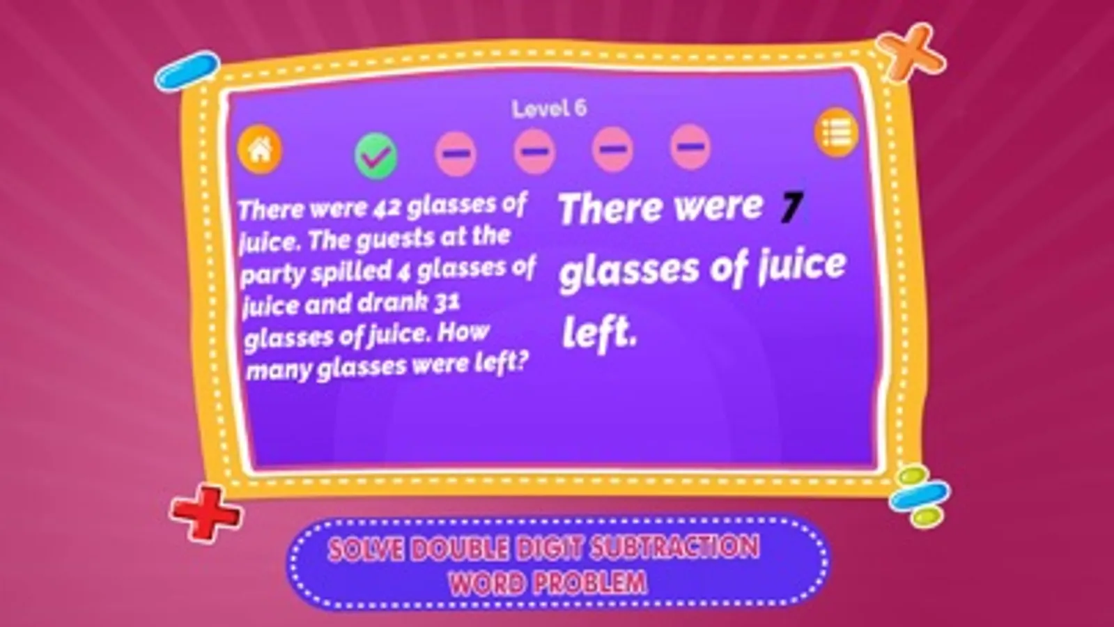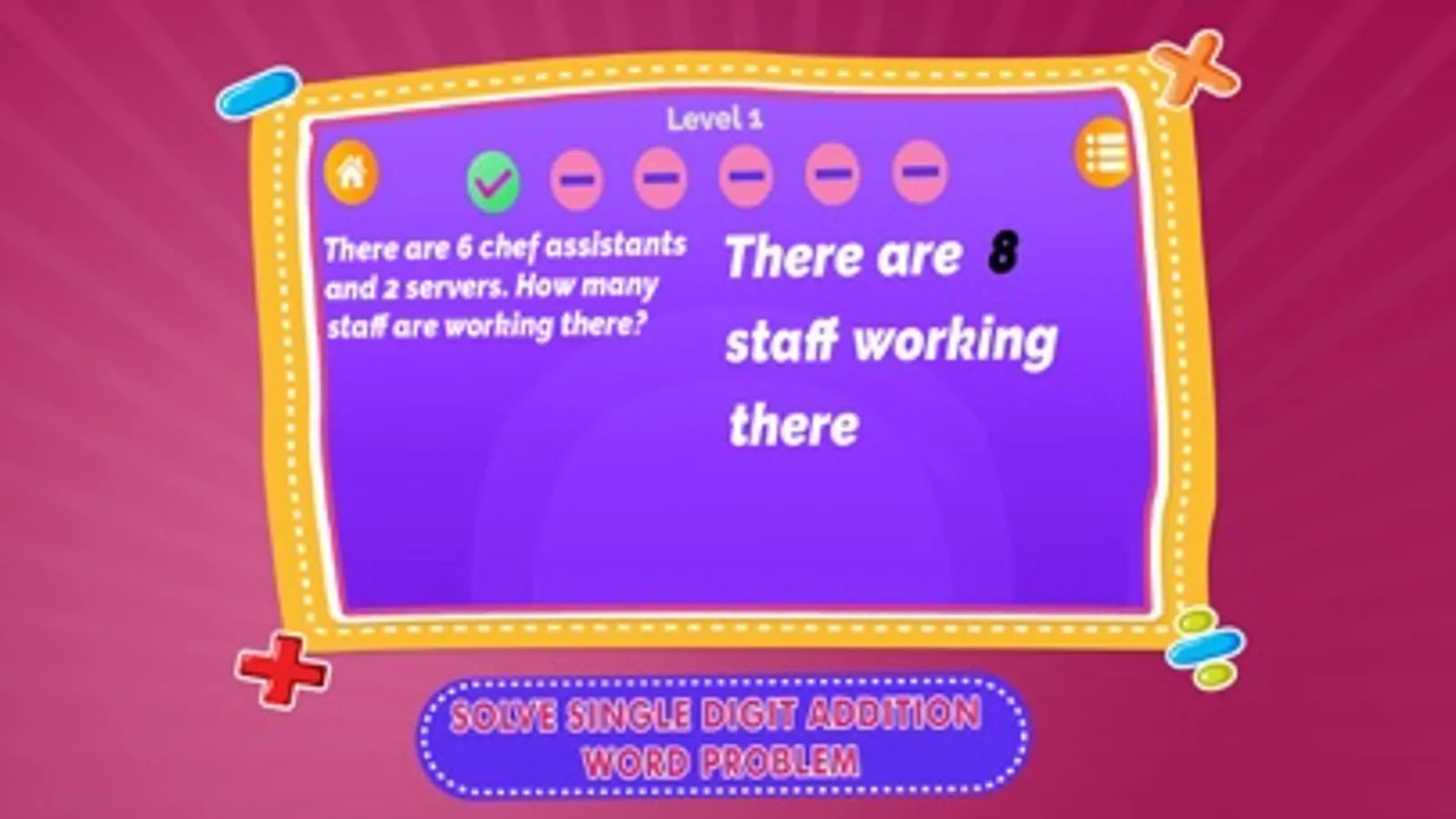 This math story problem app strives for a step by step approach to build up your child’s confidence, motivation and help him with math story problems. A child is not mentally ready to absorb all at once and execute it perfectly at the same time. They need time to understand, think and allow their mind to follow their own personal strategy to learn things their way. It focuses on addition and subtraction word problems by degrees and they will never get bored with learning math.