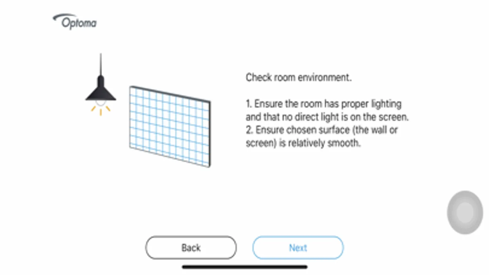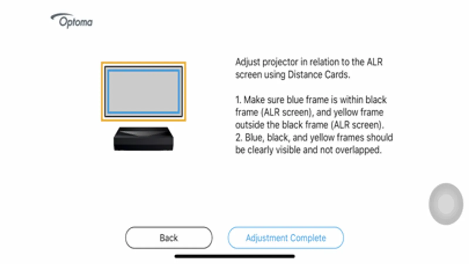 Simply connect app and optoma P1 UST projector, customer can easily follow 3 steps to complete calibration and have perfectly fit projection screen on the ALR screen.