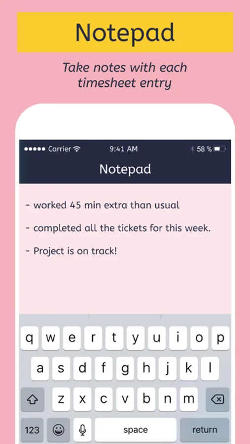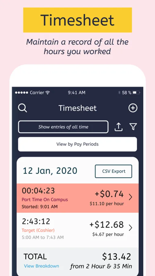Manage all your time entries in one single timesheet. The app automatically calculates your pay based on the number of hours recorded in the timesheet.
