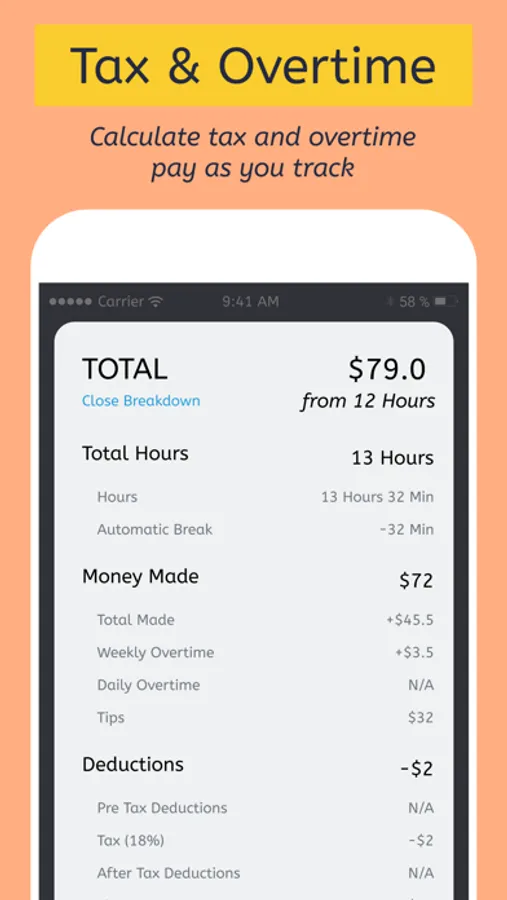 The app automatically calculates your actual earnings by subtracting your taxes and deductions.