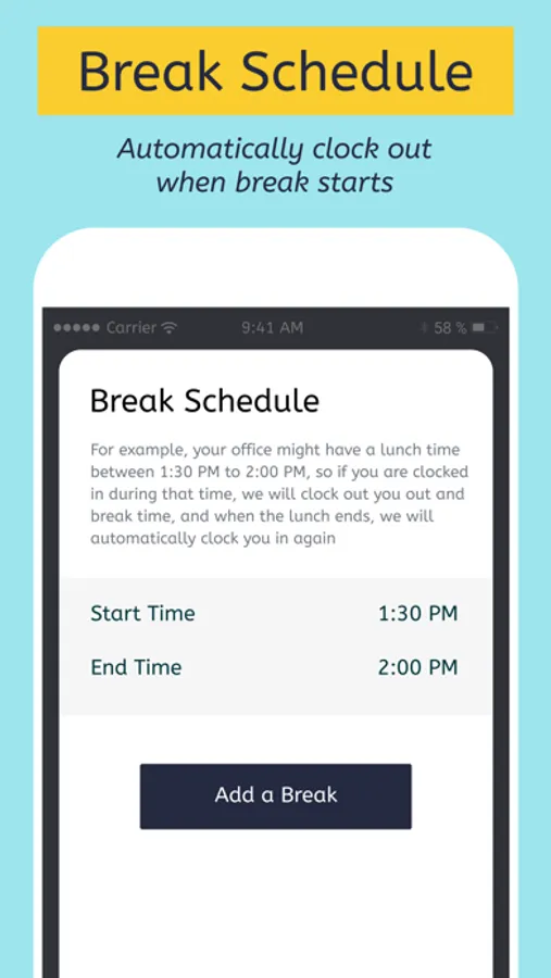 Break schedule allows you to automatically clock out when your lunch break starts and clock in back when the lunch break ends.