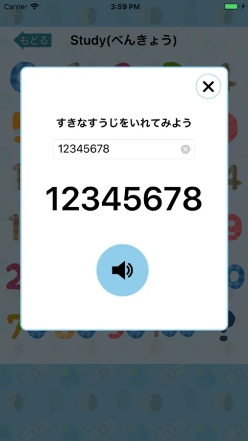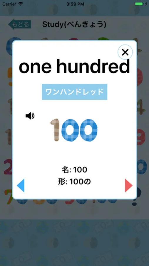 テストは1~100までの数字に対する読み方を4択問題式で解く問題が出題されます。