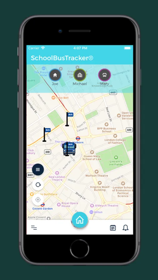 Mobile parent app part of a unique school transport software suite. Parents and guardians receive private notifications to their smart phone, showing collection and drop off points of their children whilst they are on their school bus route. Advanced parent notifications of bus departure, arrival and proximity location(one stop away from pick up or destination). Parents can make temporary route changes for their children as well as report their absence easily with our integrated messaging module.