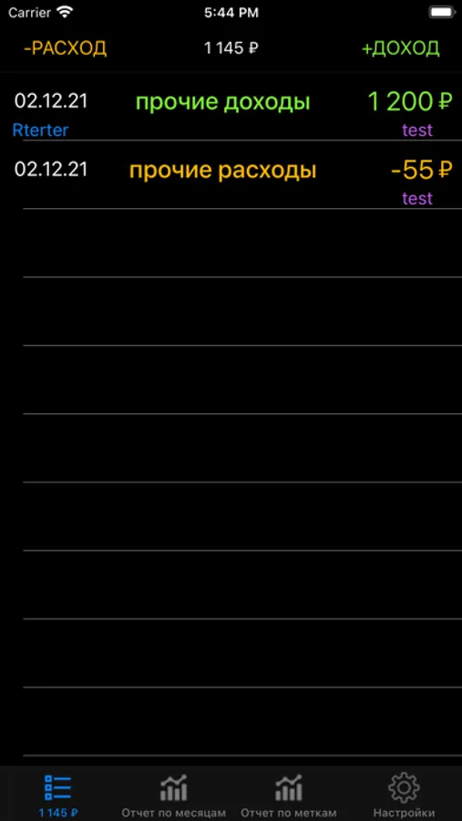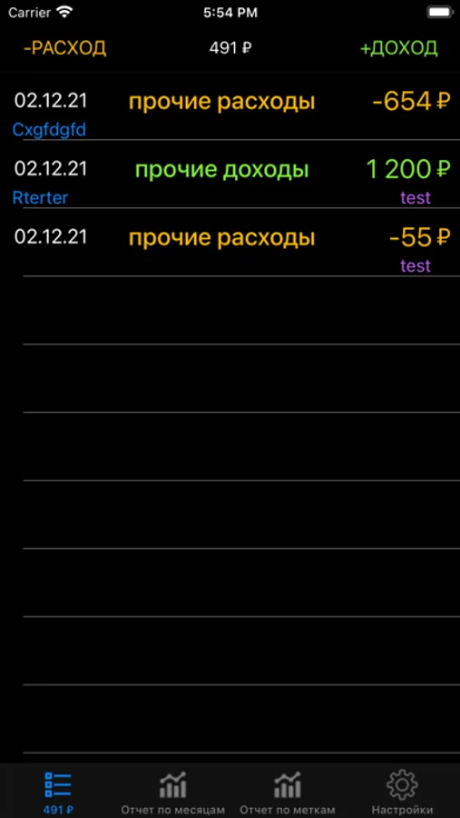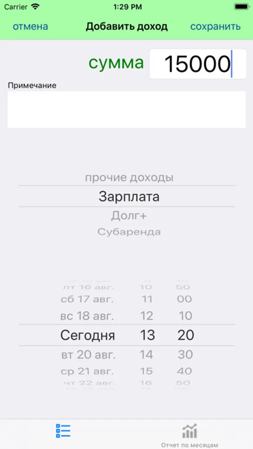 Вывод отчетов за месяц, сводный , по категориям, по меткам, подробный.