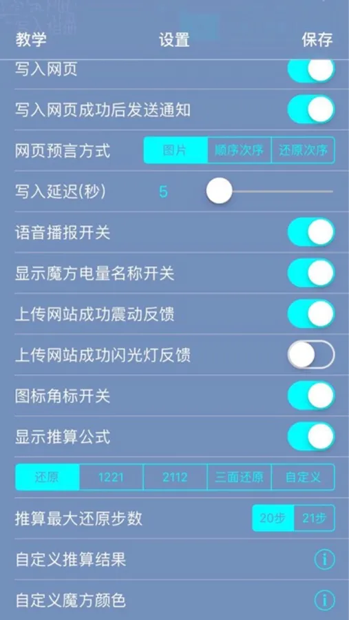 此App需要配合我们的魔方进行,使用蓝牙,实时传输魔方数据,呈现魔方的54个色块的全部颜色。并且我们就魔方色块数据进行分析,在0.1秒内推算出还原方法或者到达你自定义的序,例如1221,2112,三面还原等。而且还原步骤采用英文字母或者中文汉字呈现,最关键的是我们将还原步骤控制在20或者21步以内,以符合上帝之数20的特点。