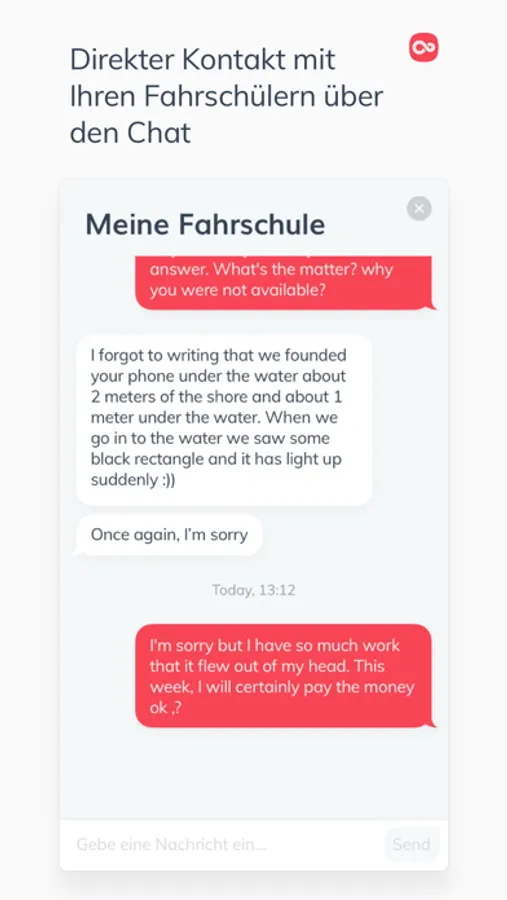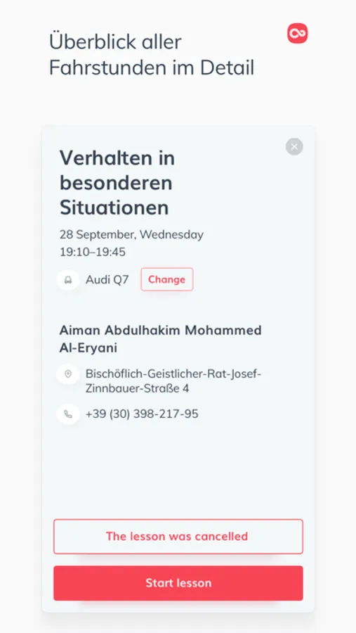 With the integrated calendar function, you can book or cancel appointments quickly and easily. Your student will automatically receive a message if you have made any changes to the appointments. Do you still have questions for the student or do you want to quickly clarify a question with the office manager in your driving school? Arrangements can easily be made via the chat function on your app. For an all-round overview, you can also call up individual student profiles and view all past and upcoming lessons and further information about the student or the lesson in detail.