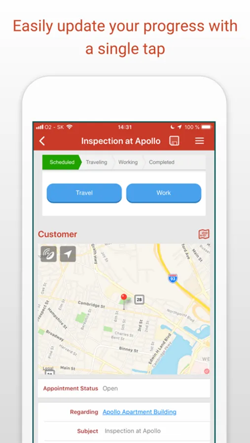 • Thanks to the integrated timesheet management you can efficiently track time spent on a visit and increase productivity