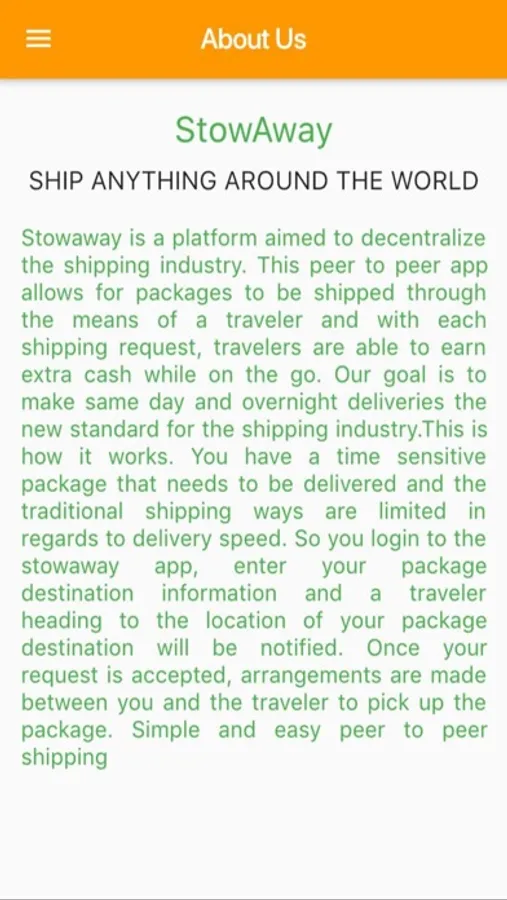 Stowaway is a platform aimed to decentralize the shipping industry. This peer to peer app allows for packages to be shipped through the means of a traveler and with each shipping request, travelers are able to earn extra cash while on the go. Our goal is to make same day and overnight deliveries the new standard for the shipping industry.