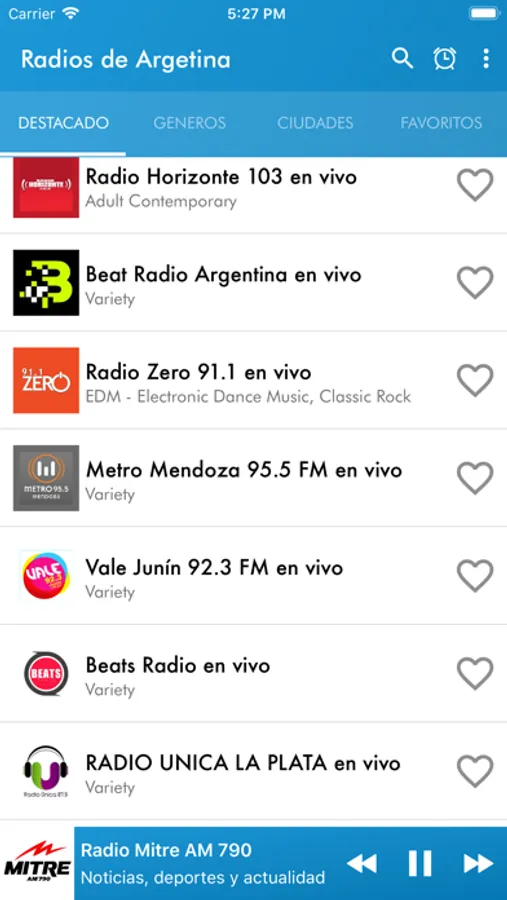 ¡Escuchar Radios de Argentina en Vivo nunca fue tan fácil! Disfruta de las transmisiones sin interrupciones de los mejores géneros Latin, Romanticas, Cumbia, Classical , Jazz, POP, rock, electro, dance, hip hop, disco, y ¡hasta música del recuerdo! Canta a todo pulmón y baila al ritmo de la música que te mueve. Escucha noticias, eventos deportivos, narraciones de partidos, y disfruta cuando quieras y donde quieras. No te quedes atrás y mantente siempre al tanto de las tendencias musicales y todo lo que está sonando en Argentina.