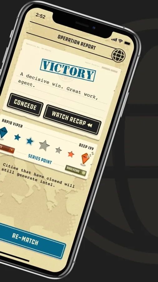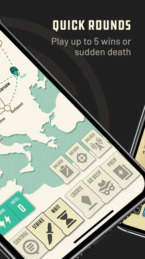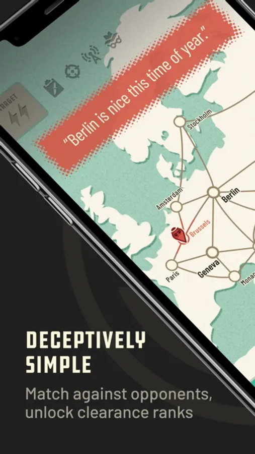 Two Spies is a turn-based spy training program where you face off against an opponent in Cold War Europe. Sneak to gain cover, control cities' informants to capture areas of the map, deduce your target's location – or trick them into revealing it – and strike to win the round.