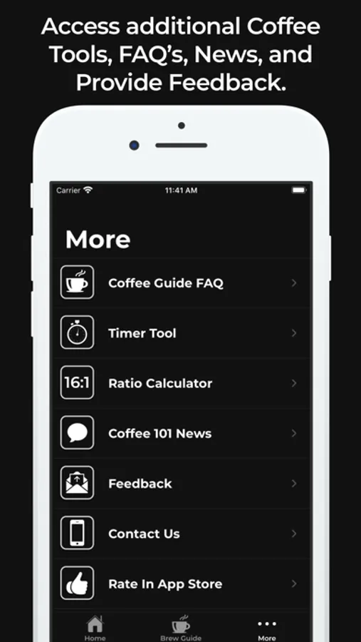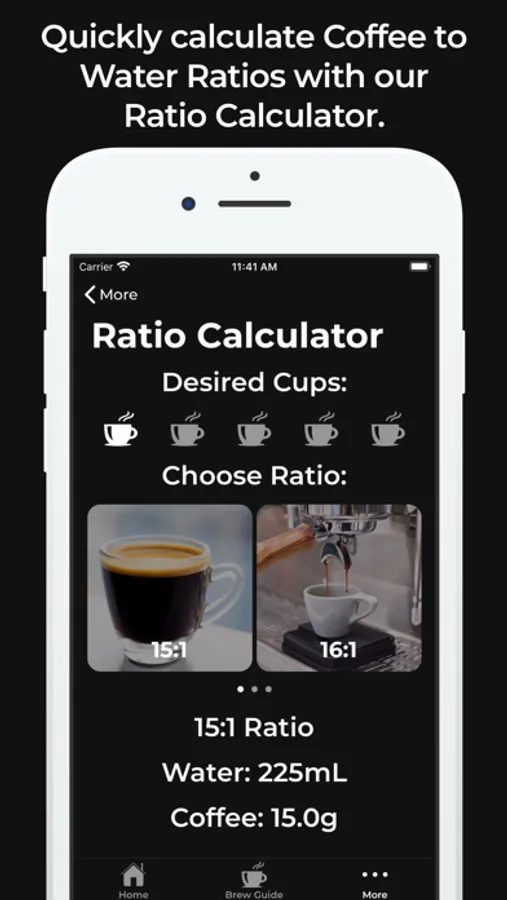 Coffee 101 also has a built in Timer that gives you the current step in your Brew Guide alongside the elapsed time. There is also a Ratio Calculator that will tell you how much Coffee to Water ratio you need by easily choosing how many cups you wish to make.