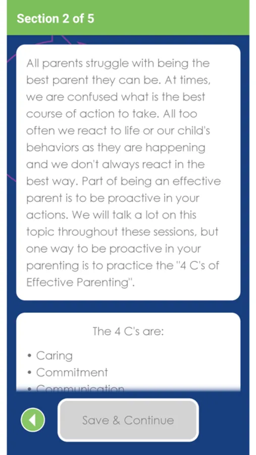 The app contains 8-modules that include the following topics: healthy relationships; goal setting; communication; skill-building; adolescent development; abstinence; birth control/condoms; STD’s/STI’s and HIV/AIDS; birth spacing; domestic violence; education; jobs and careers; and community resources. Throughout each module teen mothers will be asked to read the content, watch videos and read supplemental information, as well as answer a variety of questions related to the information in that module. Each module can take up to one hour to complete, with the hope of all 8 being completed by the time their baby is 6 months old. Electronic notifications are sent as reminders to complete each module. Teen mothers can save their work and come back into the app at a later time, allowing for flexibility to meet their needs.