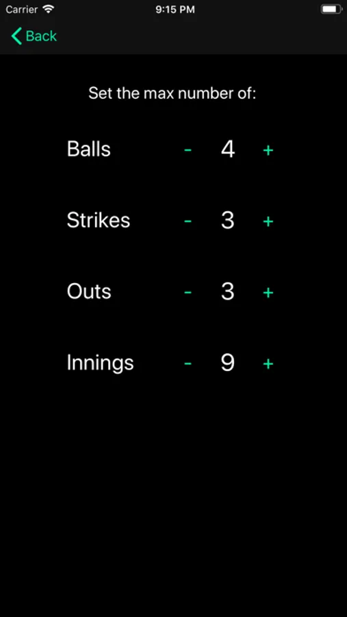 Want to have a non-traditional game with 7 balls, 2 strikes, and 10 outs? You can also set the maximum number of each category.