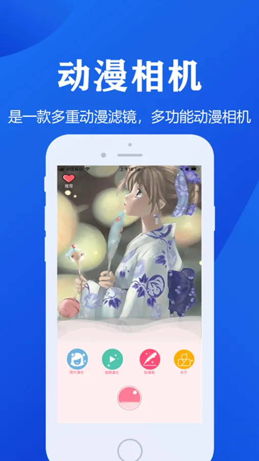 手机拍动漫视频和动漫图片。处理普通图片和原视频为动漫效果,动漫头像可以做自己制作,漫画相册等。是一款有多重动漫滤镜、多功能的的动漫相机。