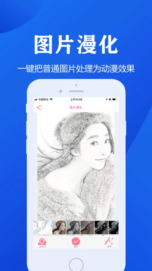 各种滤镜效果能够详细地设置和调节,实时拍照看到效果,同时也能够美化手机里面的照片,成为动漫。每个人都是导演!