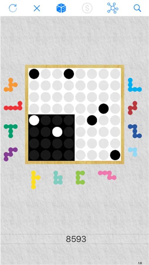 Arrange the four board wedges by yourself or roll the dice to pick a configuration. Then the fun begins. Twelve colored shapes appear. Your task is to fit the shapes into the board. Avoid the black/white spots as those are no-go areas.